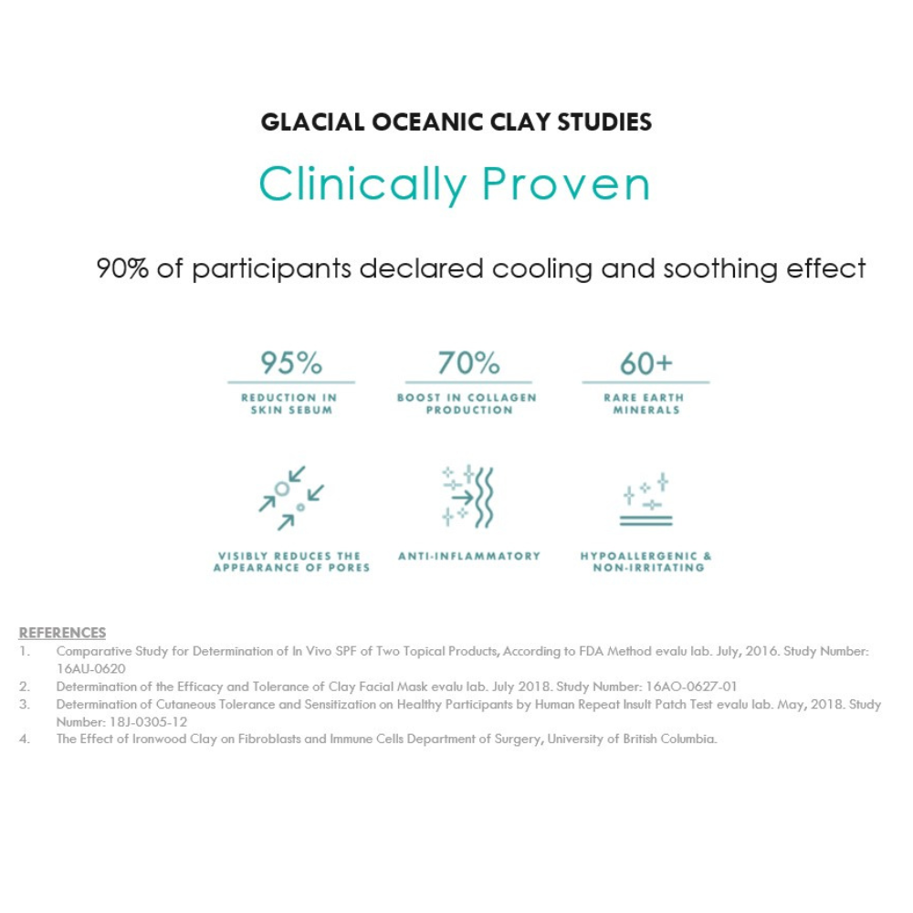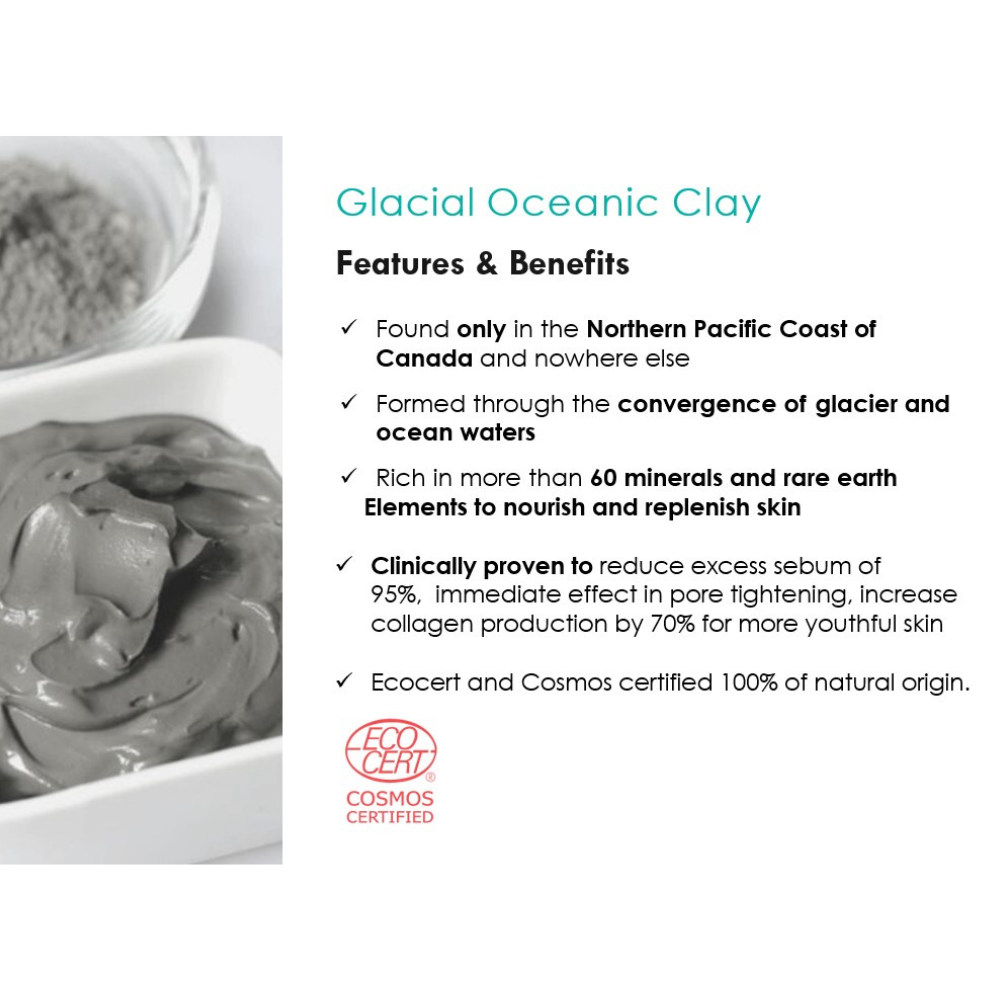 Glacial Oceanic Clay is the main ingredient in our product. It’s a type of clay that can only be found in Northen BC, Canada. Born at ancient glaciers in the Pacific Ocean, which have spent centuries collecting sediments rich in skin-boosting vitamins and minerals, our Canadian Glacial Oceanic Clay is unlike any other in the world – enriched by the cyclical flow of ocean and glaciers, the clay has absorbed more than 60 minerals and rare elements - zinc, iron, magnesium and potassium. We use a sustainable harvesting process to source our clay, and a refined procedure to extract its pristine Canadian Glacial Mineral Water.